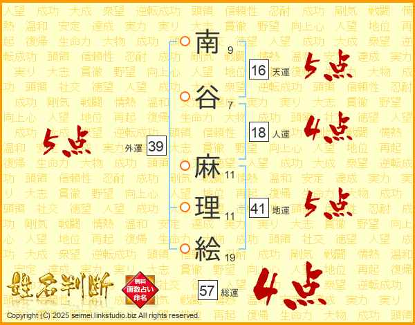 南谷麻理絵さんの外運は39画の5点!