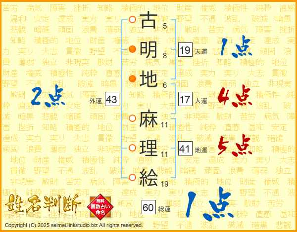 古(5画)明(8画)地(6画) 麻(11画)理(11画)絵(19画)