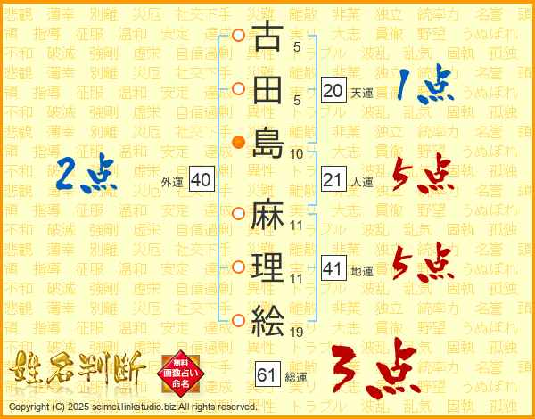 古(5画)田(5画)島(10画) 麻(11画)理(11画)絵(19画)