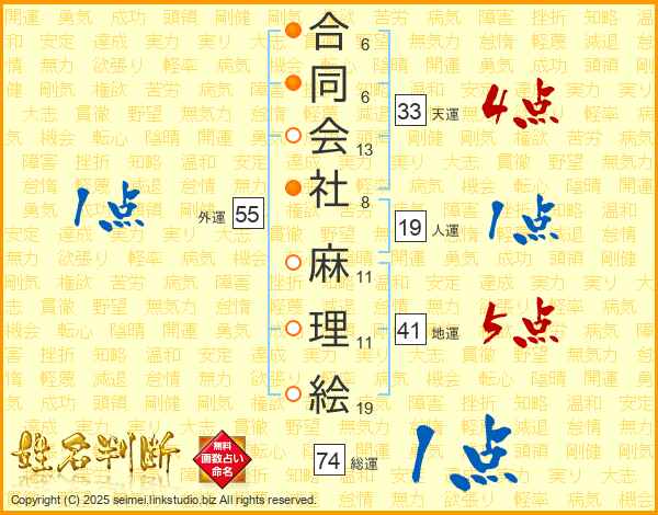 合(6画)同(6画)会(13画)社(8画) 麻(11画)理(11画)絵(19画)