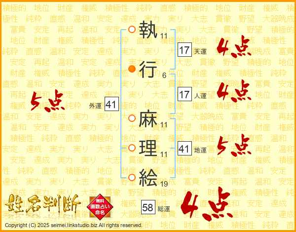 執(11画)行(6画) 麻(11画)理(11画)絵(19画)