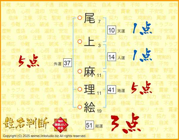 尾(7画)上(3画) 麻(11画)理(11画)絵(19画)