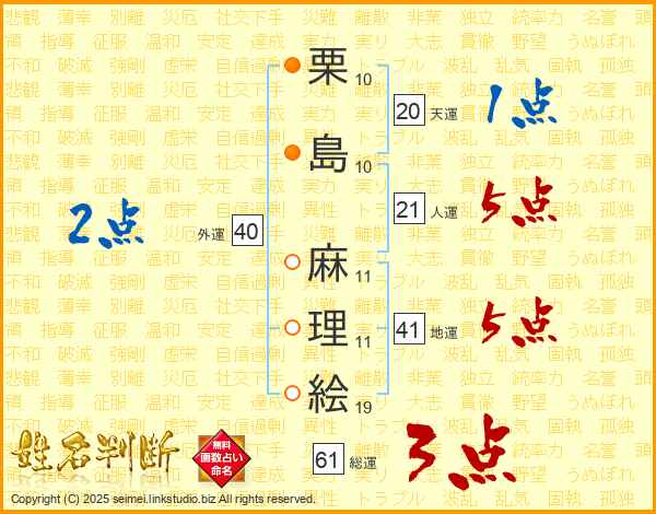栗(10画)島(10画) 麻(11画)理(11画)絵(19画)