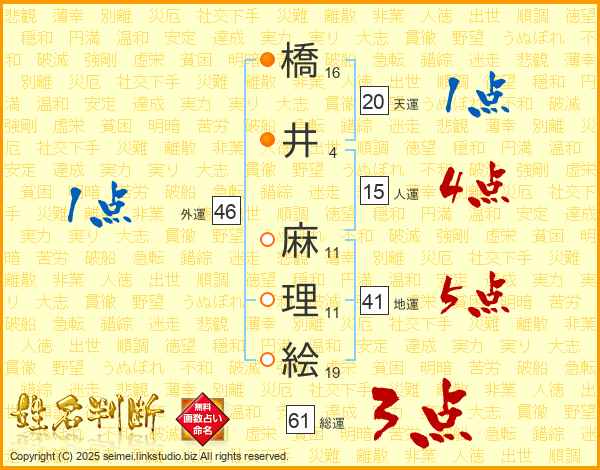 橋(16画)井(4画) 麻(11画)理(11画)絵(19画)