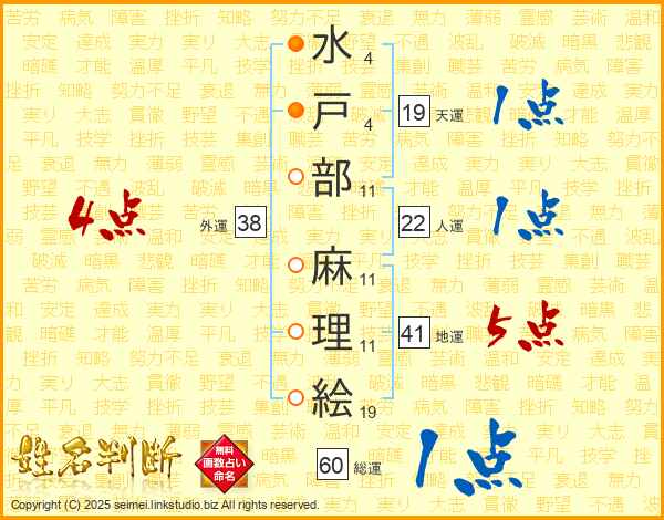 水(4画)戸(4画)部(11画) 麻(11画)理(11画)絵(19画)