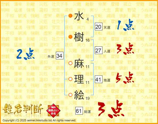 水(4画)樹(16画) 麻(11画)理(11画)絵(19画)