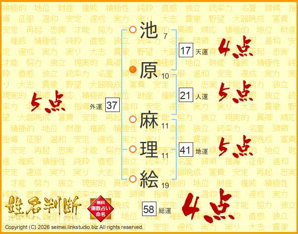 池(7画)原(10画) 麻(11画)理(11画)絵(19画)