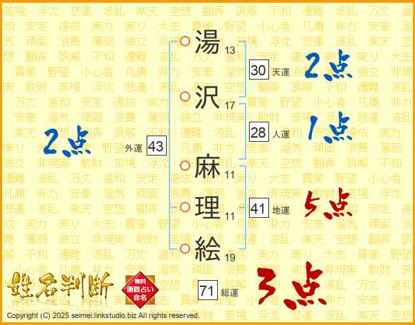 湯(13画)沢(17画) 麻(11画)理(11画)絵(19画)