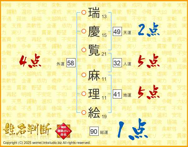 瑞(13画)慶(15画)覧(21画) 麻(11画)理(11画)絵(19画)