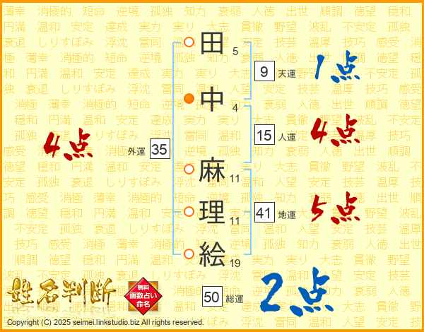 田(5画)中(4画) 麻(11画)理(11画)絵(19画)