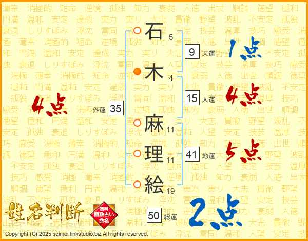 石(5画)木(4画) 麻(11画)理(11画)絵(19画)