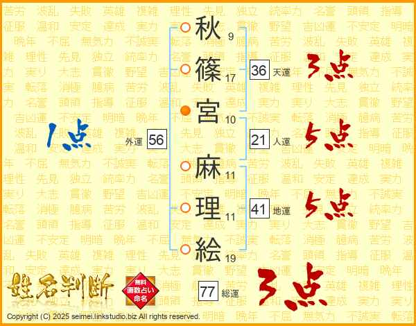 秋(9画)篠(17画)宮(10画) 麻(11画)理(11画)絵(19画)