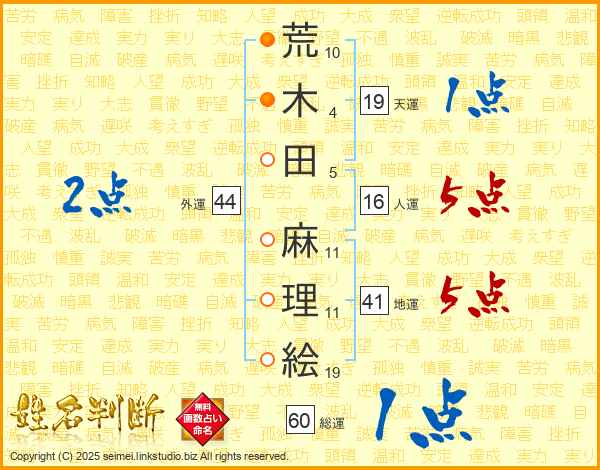 荒(10画)木(4画)田(5画) 麻(11画)理(11画)絵(19画)