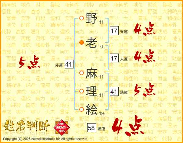 野(11画)老(6画) 麻(11画)理(11画)絵(19画)