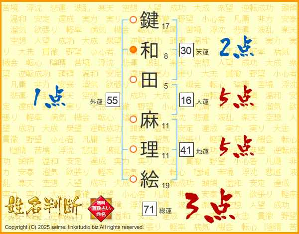鍵(17画)和(8画)田(5画) 麻(11画)理(11画)絵(19画)