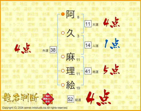 阿(8画)久(3画) 麻(11画)理(11画)絵(19画)