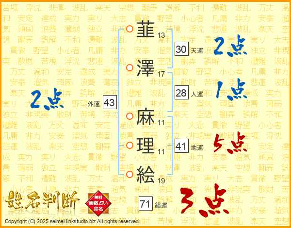 韮(13画)澤(17画) 麻(11画)理(11画)絵(19画)
