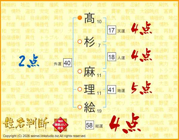 髙(10画)杉(7画) 麻(11画)理(11画)絵(19画)