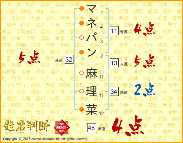 マ(2画)ネ(4画)パ(3画)ン(2画) 麻(11画)理(11画)菜(12画)