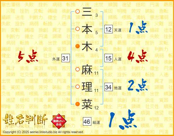 三(3画)本(5画)木(4画) 麻(11画)理(11画)菜(12画)