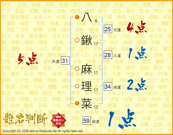 八(8画)鍬(17画) 麻(11画)理(11画)菜(12画)