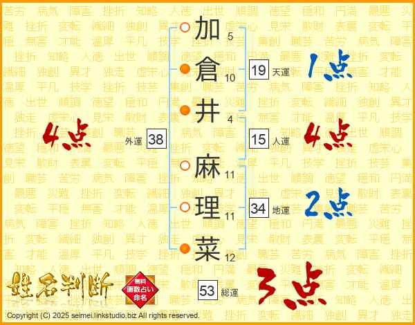 加(5画)倉(10画)井(4画) 麻(11画)理(11画)菜(12画)
