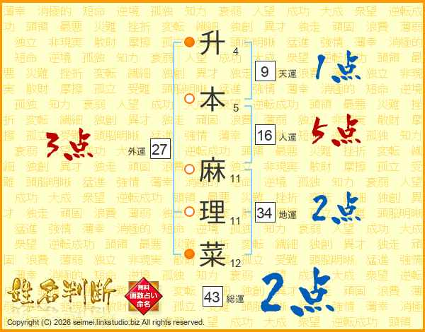 升(4画)本(5画) 麻(11画)理(11画)菜(12画)