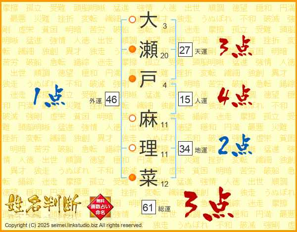 大(3画)瀬(20画)戸(4画) 麻(11画)理(11画)菜(12画)