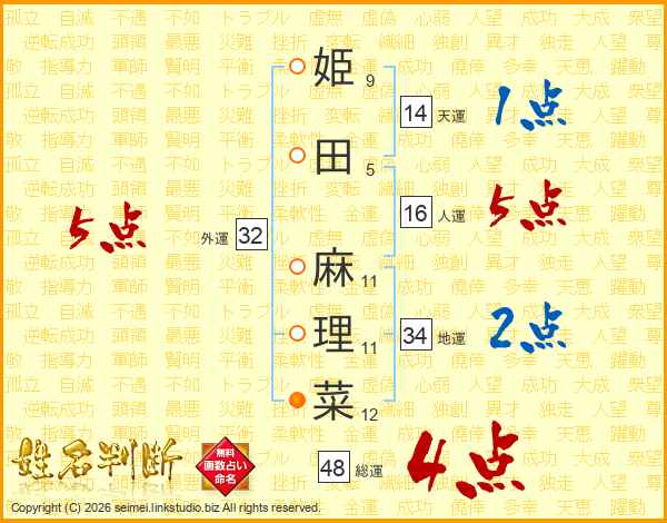 姫(9画)田(5画) 麻(11画)理(11画)菜(12画)