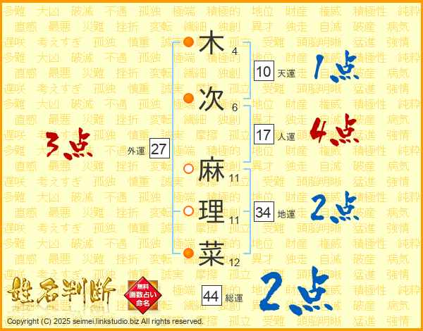 木(4画)次(6画) 麻(11画)理(11画)菜(12画)
