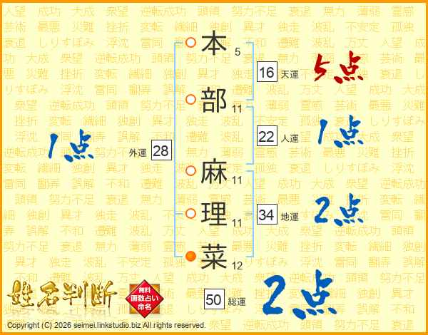 本(5画)部(11画) 麻(11画)理(11画)菜(12画)