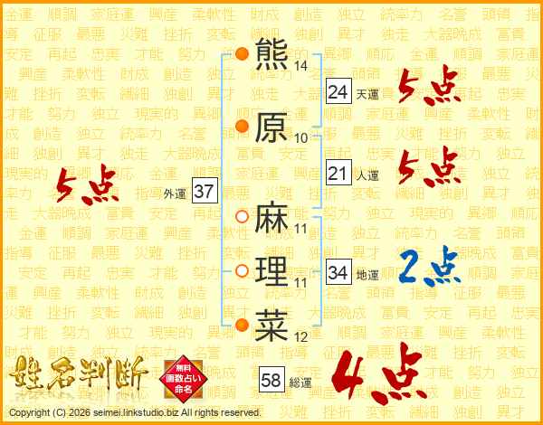 熊(14画)原(10画) 麻(11画)理(11画)菜(12画)