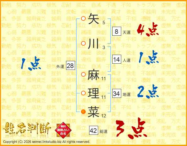 矢(5画)川(3画) 麻(11画)理(11画)菜(12画)