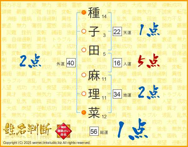 種(14画)子(3画)田(5画) 麻(11画)理(11画)菜(12画)