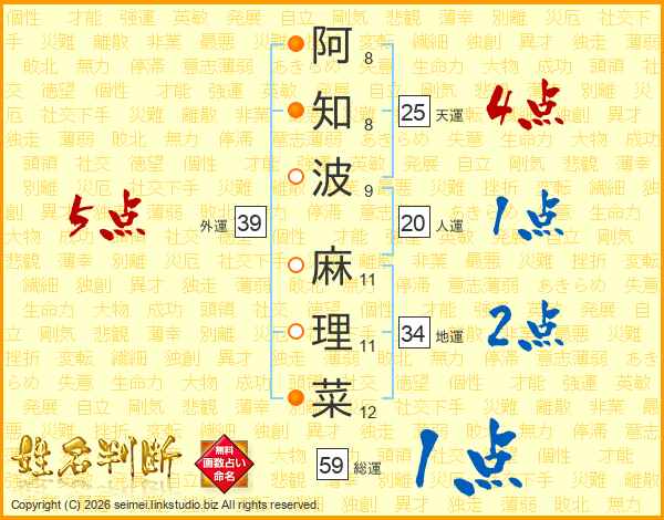 阿(8画)知(8画)波(9画) 麻(11画)理(11画)菜(12画)