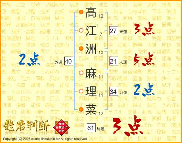 高(10画)江(7画)洲(10画) 麻(11画)理(11画)菜(12画)