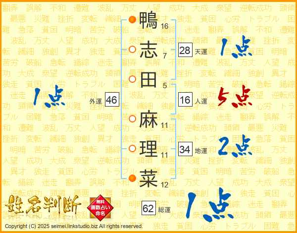 鴨(16画)志(7画)田(5画) 麻(11画)理(11画)菜(12画)