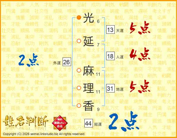 光(6画)延(7画) 麻(11画)理(11画)香(9画)
