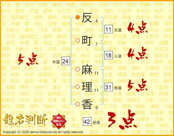 反(4画)町(7画) 麻(11画)理(11画)香(9画)