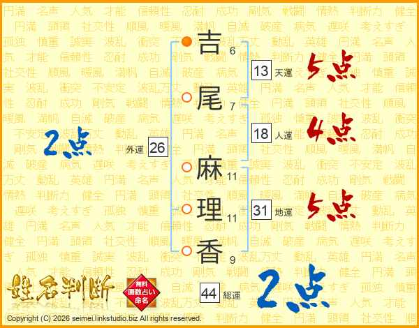 吉(6画)尾(7画) 麻(11画)理(11画)香(9画)