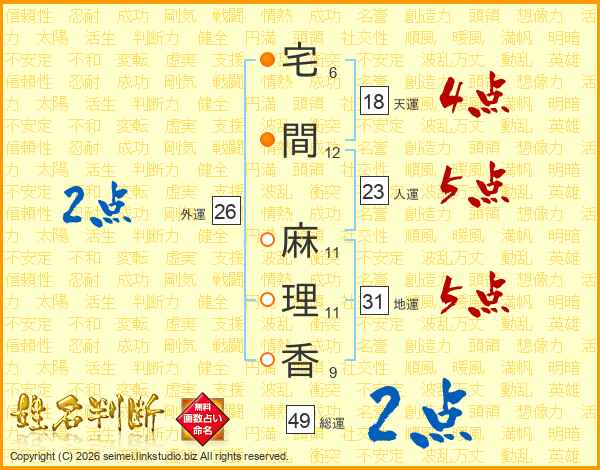 宅(6画)間(12画) 麻(11画)理(11画)香(9画)