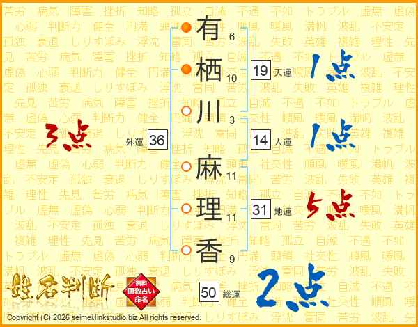 有栖川麻理香さんの外運は36画の3点!