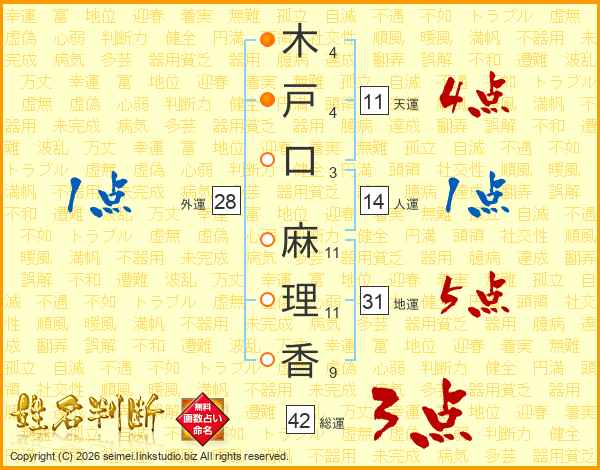 木(4画)戸(4画)口(3画) 麻(11画)理(11画)香(9画)