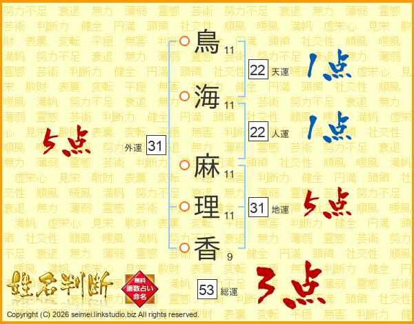 鳥(11画)海(11画) 麻(11画)理(11画)香(9画)