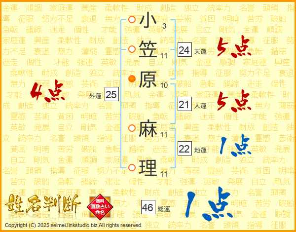 小(3画)笠(11画)原(10画) 麻(11画)理(11画)