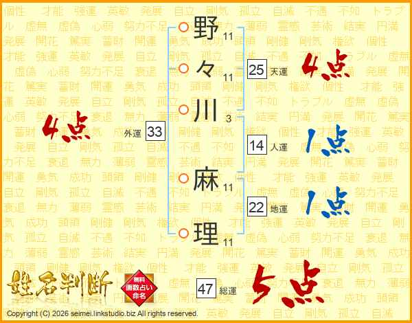 野(11画)々(11画)川(3画) 麻(11画)理(11画)