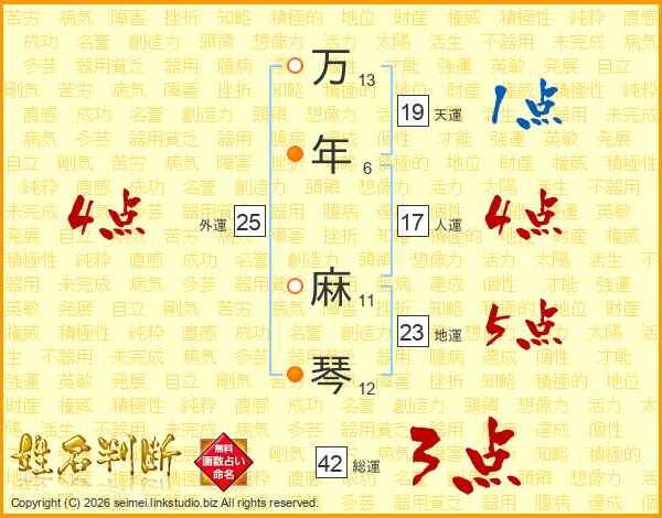 生活面を象徴する運勢です。外部から受ける影響力を表し、結婚運、家庭運や職場、環境への順応性を表します。総運から人運を引いた画数。姓や名が1文字の場合を除く。