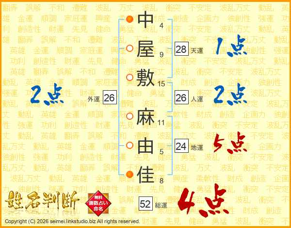 中屋敷麻由佳さんの総運は52画の4点!