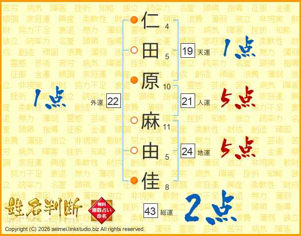 仁(4画)田(5画)原(10画) 麻(11画)由(5画)佳(8画)