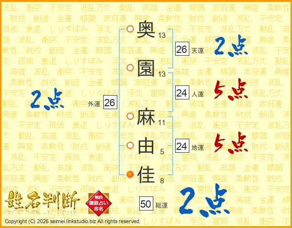 奥(13画)園(13画) 麻(11画)由(5画)佳(8画)